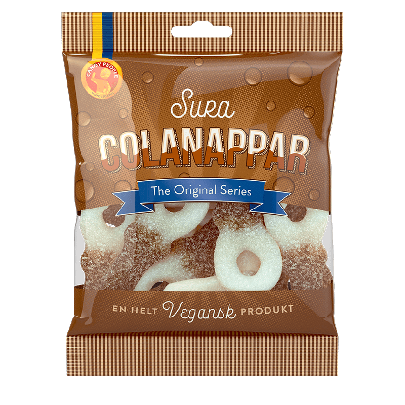Sura Cola Nappar are soft, chewy gummies shaped like small pacifiers and coated in a layer of sour sugar. The taste combines sweet cola with a sharp sour bite that gives each piece a lively and fizzy feel.