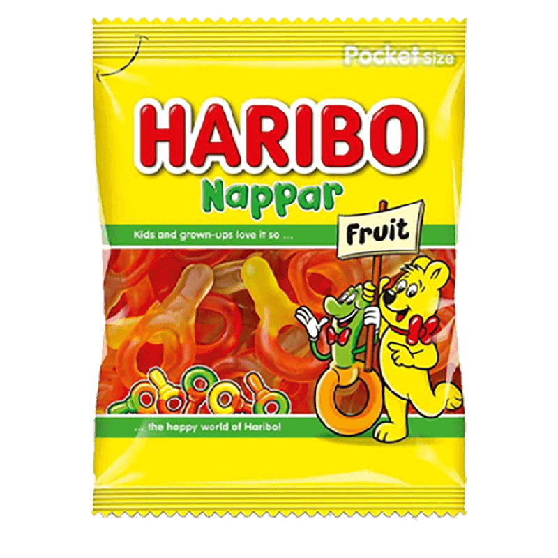 Haribo Frukt Nappar are chewy gummies shaped like small pacifiers. They come in a mix of fruit flavors that are sweet, mild and easy to enjoy. The soft texture and playful shape make them a favorite for both kids and adults.