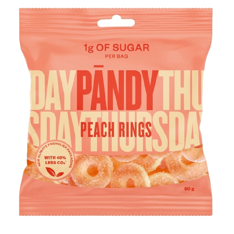 Pändy Peach Rings offer the sweet, juicy taste of ripe peaches in soft gummy rings. Their smooth texture and vibrant flavor make them a classic candy choice with a fresh, modern feel.