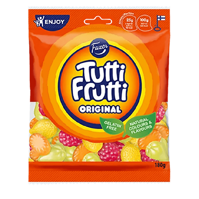 Tutti Frutti Original is a soft and fruity jelly candy mix with flavors like apple, pear, raspberry and lemon. Each piece is shaped like a fruit and comes in bright colors such as yellow, green, red and orange. The taste is fresh and sweet, with a mild tang that lasts from start to finish.
