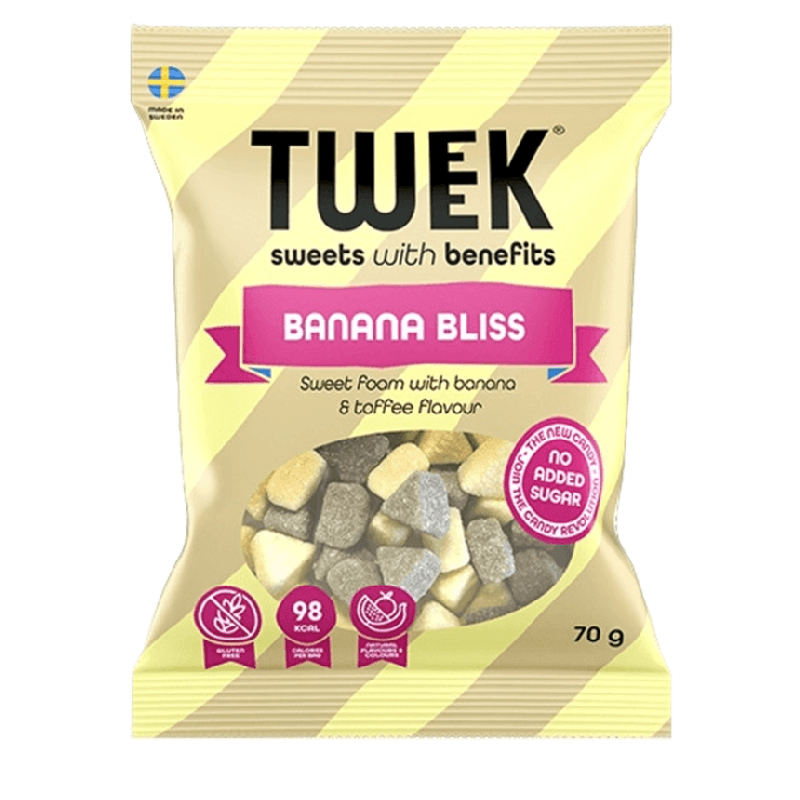 Tweek Banana Bliss offers soft and fluffy foam candy with sweet banana flavor and a gentle sour sugar coating. The texture is airy and chewy, delivering a nostalgic banana taste with a playful candy twist.
